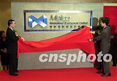 「新濠國際」澳門區(qū)總部十九日在澳門宣布成立,圖為在成立儀式上「新濠國際」董事總經(jīng)理何猷龍(左)等為澳門區(qū)總部揭牌。中新社記者:李剛