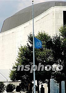聯(lián)合國駐巴格達總部大樓十九日遭炸彈襲擊,二十人在爆炸中喪生,紐約聯(lián)合國總部隨即降半旗致哀。中新社記者:趙海燕