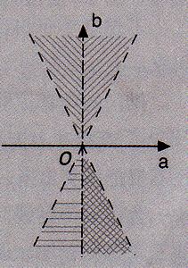 在圖A、B和D中,凡邊界均以虛線示之,凡不連通的區(qū)域均以不同斜率的陰影線區(qū)別之。然而,在標(biāo)準(zhǔn)答案圖C中的b軸用實線表示,并且b軸兩側(cè)與b軸相鄰的角形區(qū)域用同一斜率的連貫陰影線表示為單一的連通區(qū)域,所以b軸明確地不是邊界。這樣就使“不包括邊界”這個附注不能對b軸發(fā)生作用。圖C中只有兩根邊界(虛線表示),所以圖像M表示了不等式F(|b|>|2a|),而不表示不等式E(|b|>|2a|,且a≠0)。所以標(biāo)準(zhǔn)答案圖C是錯誤的。四個選項中沒有一個正確,這與提示中所說“在每小題給出的四個選項中,只有一項是符合題目要求的”相矛盾,從而該題是錯題!而正確答案應(yīng)為圖二。
