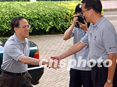 香港警務(wù)處長曾蔭培,八月二十一日在香港少年警訊滅罪夏令營活動上,迎候政務(wù)司司長曾蔭權(quán)。中新社記者:錢興強