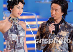 香港明星曾志偉 ,在二十三日晚紅(石+勘)香港體育館舉行的2003年度香港小姐競選決賽上擔任司儀 。 中新社傳真 錢興強 攝
