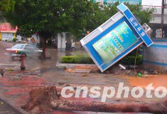 八月二十五日清晨,“科羅旺”臺風襲擊海南省?谑。?谑薪值辣姸酂粝涫綇V告牌被吹到在地。作者:蔣聚榮