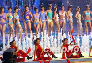 據(jù)美國(guó)《世界日?qǐng)?bào)》報(bào)道,始于1973年的港姐選舉,今年是第31屆。本屆決賽主題是“秋水伊人――脫俗出塵”,主辦單位香港電視廣播有限公司(無(wú)線)特意斥巨資在場(chǎng)內(nèi)搭建大型游泳池突顯主題。佳麗們時(shí)而在泳池中“芙蓉出水”,時(shí)而在封蓋的泳池上歌舞。背景臺(tái)上描繪的是典雅的中國(guó)山水畫,映襯出佳麗們脫俗的氣質(zhì)。