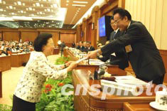 十屆全國(guó)人大常委會(huì)第四次會(huì)議今天上午在北京人民大會(huì)堂舉行,全國(guó)人大常委會(huì)副委員長(zhǎng)李鐵映在會(huì)上主持了任命書(shū)頒發(fā)儀式。