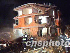 福建省閩侯縣上街鎮(zhèn)沙堤村德州路一民居8月26日22時30分許發(fā)生大爆炸,爆炸中心方圓約60米內(nèi)的木結(jié)構(gòu)民居全部倒塌,并使一座4幢樓房被毀。至27日上午11時,救援人員在爆炸現(xiàn)場已找到12具尸體。中新社 圖