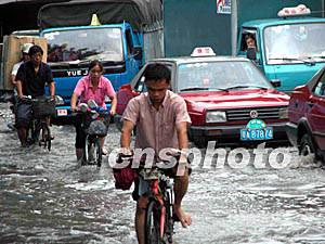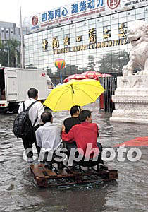 “杜鵑”臺(tái)風(fēng)給廣州帶來(lái)了狂風(fēng)暴雨,不少地方出現(xiàn)水淹現(xiàn)象,三日,廣州外貿(mào)中心正舉辦一個(gè)大型展覽,賓客們只好利用臨時(shí)拼造的“小舟”進(jìn)館。作者:梁永強(qiáng)