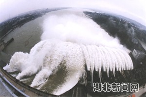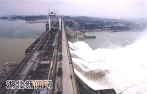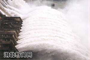 中新湖北網(wǎng)9月9日電 漢江第二次洪峰于八日凌晨一點(diǎn)到達(dá)丹江口水庫,最大洪峰流量達(dá)二萬八千五百立方米每秒,大約在今天下午五點(diǎn)丹江口水庫水位將達(dá)到一百五十六點(diǎn)七米,為一九八四年來最高水位。為緩解對水庫壓力,丹江口水庫開閘向下游泄洪。劉鐵軍 攝