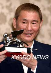 中新網(wǎng)9月10日電 在第60屆威尼斯國際電影節(jié)上以古裝片《座頭市》榮獲最佳導(dǎo)演獎的日本導(dǎo)演北野武(Kitano Takeshi)8日在東京舉行記者招待會,從當(dāng)天回國的北野事務(wù)所的森昌行社長手里接過銀獅獎杯。