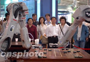 為期四天的第六屆中國北京國際科技產(chǎn)業(yè)博覽會十二日在北京拉開序幕,首鋼集團(tuán)展出的機(jī)器人象棋表演賽吸引觀眾。中新社記者:張宇