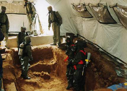 防化———挖掘現(xiàn)場搭建負壓通風帳篷,一旦毒彈發(fā)生泄露,毒氣不易外泄。此次回收與以往最大不同在于,挖掘點使用的防毒面具是隔絕式的貯氣面具,所供氧氣為專供,以防止高濃度光氣對面具的穿透和芥子氣毒劑對人體的傷害。場區(qū)多點進行不間斷的空氣樣品毒劑檢測分析,及時發(fā)現(xiàn)毒劑泄露。