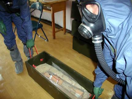 具體的處理程序是:金屬探測————先通過電磁探測,測出毒彈掩埋的準確邊際,確定挖掘的方位;挖掘作業(yè)————使用銅針、銅鏟等器具,小心將已經(jīng)銹蝕、滲漏的毒氣彈挖掘出來;冷卻處理————將挖掘出的毒氣彈放置到零下40℃的冷藏柜,進行12個小時的冷卻,使毒氣彈溫度降到零下30℃;X光鑒別————通過大功率X光鑒別,搞清楚毒彈內部結構;彈、藥分離———將彈體切割;外形鑒別;密封包裝。