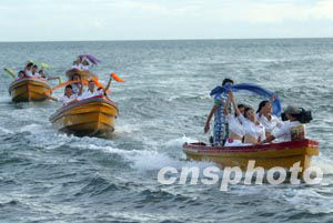 九月十三日晚,2003年新絲路中國模特大賽在海南三亞的天涯海角的海灘舞臺(tái)上進(jìn)行最后的排練,這次決賽的參賽模特將從海上登陸演出舞臺(tái)。中新社記者:盛佳鵬