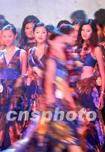 九月十三日晚,在2003年新絲路中國模特大賽海南三亞天涯海角的演出排練現(xiàn)場,身著絢麗晚裝出場的模特成為舞臺(tái)上流動(dòng)的風(fēng)景。中新社記者:盛佳鵬