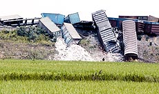 記者看到,脫軌的車廂共有19節(jié)。有兩節(jié)車廂完全橫在了鐵路中央,另幾節(jié)側(cè)翻在鐵路一側(cè),還有兩節(jié)沖下了鐵路路基,多處鐵軌呈彎曲狀,許多車廂的車輪已經(jīng)飛落到周圍的稻田里,路邊的幾根電線桿被連根拔起。列車上集裝箱內(nèi)的瓷磚、大理石等散落一地。據(jù)有關(guān)部門認(rèn)定,脫軌車廂位于列車第27至45節(jié)。南昌鐵路局目前已組織人員在現(xiàn)場(chǎng)進(jìn)行緊急救援。