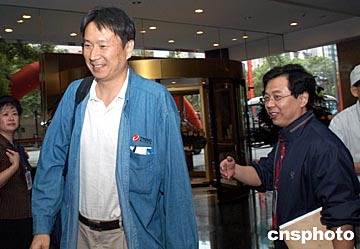 北京新浪聯(lián)席董事長姜豐年九月二十一日中午抵達長沙,準備出席二十二日開幕的“第二屆世界華文傳媒論壇”,圖為中國新聞網(wǎng)孫永良(右)與新浪聯(lián)席董事長姜豐年。中新社記者:張宇