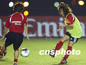 美國(guó)當(dāng)?shù)貢r(shí)間9月20日晚7點(diǎn),參加女足世界杯的中國(guó)女足在美國(guó)洛杉磯南部小城卡森體育場(chǎng)開(kāi)賽前的最后一場(chǎng)熱身訓(xùn)練。圖為范運(yùn)杰在訓(xùn)練中突破射門。作者:劉占坤