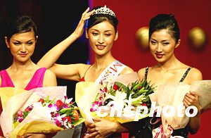 來(lái)自吉林的二十一歲大學(xué)生關(guān)琦脫穎而出獲得冠軍。中新社記者:毛建軍  第五十二屆世界小姐比賽第五名、亞洲美皇后吳英娜為關(guān)琦戴上桂冠。中新社記者:毛建軍