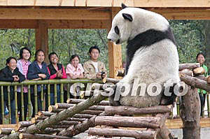 記者在現(xiàn)場看到,兩只大熊貓進(jìn)入新獸舍后調(diào)皮地爬上鐵欄桿玩耍,一只名叫龍騰的大熊貓搬進(jìn)新居后,便迫不及待地直撲室外放養(yǎng)場,興奮地四處奔跑。它時而啃食竹子,時而沿著圍墻邊蹚水嬉戲。放養(yǎng)場中間用木頭搭建的梯子則成了龍騰的健身場,只見它大搖大擺踱上梯子,又變著花樣從梯子上倒翻下來,其姿態(tài)甚為撒嬌。
