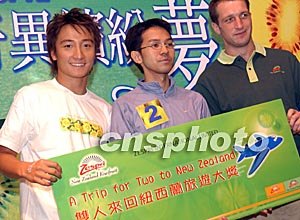 香港歌手方力申,九月二十三日在香港舉行的“ZESPRI奇異黃金夢慶祝會”上主持問答游戲。圖為一名參賽者獲得雙人往返紐西蘭旅游大獎(jiǎng)。中新社記者:錢興強(qiáng)