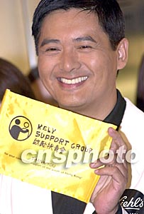 國(guó)際巨星周潤(rùn)發(fā)9月26日在香港海港城Kiehl’s專門店出席《啟勵(lì)扶青會(huì)》慈善籌款活動(dòng)啟動(dòng)儀式。周潤(rùn)發(fā)身為《啟勵(lì)扶青會(huì)》的贊助人,展示該會(huì)小旗。作者:鄧慶樂