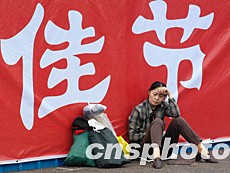 中國大陸在今春抗擊“非典”過后又恢復節(jié)日長假。圖為北京一名辛勞的女士在采購大批節(jié)日商品后,坐于擁擠的市場外小歇。中新社記者:鄒憲