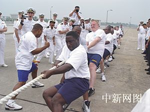 23日,中美海軍首先進行了拔河友誼比賽。拔河比賽應該說是中國海軍水兵的強項,在97年南海艦隊對美洲四國五港的訪問中,中國海軍水兵拔河隊一路上攻城拔寨、未嘗敗績。但這次美國水兵拔河隊是有備而來,且來者不善。15名隊員個個膀大腰圓、粗壯結(jié)實,比如,其中一名黑人隊員桑塔納(SANTANA),此人身高199CM,體重250斤,來自美國亞特蘭大,是艦上的武器部門人員。中方隊員與對手相比在塊頭上明顯吃了虧,處于劣勢。比賽開始前,美方隊員圍在一起,大聲鼓勁。比賽開始后,中方水兵拔河隊奮力與對手展開拉鋸戰(zhàn),雖拼盡全力,無奈實力稍遜一籌,最后不無遺憾地輸?shù)舯荣,美國水兵也算報了上次比賽的一箭之仇?/p>