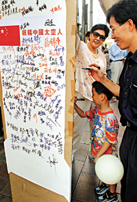 一位與父母剛逛完街預(yù)備回家的9歲男童施俊匡,在祝?埳虾灻С旨白8:教靻T。而爸爸施先生亦認(rèn)同,中國載人宇宙飛船升空是中國人的驕傲,因此希望簽名送上一點祝福。