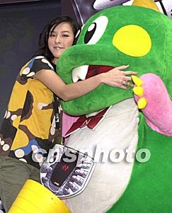歌星李蘢怡10月7日在香港出席諾基亞N-Gage手提游戲機(jī)推廣活動(dòng),擁抱可愛(ài)的卡通人物“泡泡龍”。作者:鄧慶樂(lè)