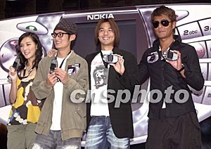 諾基亞N-Gage手提游戲機(jī)10月7日在香港舉行推廣活動(dòng),大會(huì)特別邀請(qǐng)演藝界喜好“打機(jī)一族”古天樂(lè)、馮德倫、余文樂(lè)、李蘢怡(右起)出席活動(dòng),諾基亞N-Gage除具備三頻通訊功能外,更有流動(dòng)游戲機(jī)功能。作者:鄧慶樂(lè)