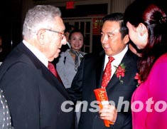 美東時(shí)間十月九日晚,美國(guó)前國(guó)務(wù)卿基辛格(左)來到紐約華爾道夫酒店,祝賀中國(guó)最大的上市銀行——招商銀行在美國(guó)設(shè)立代表處。中新社記者:陳建