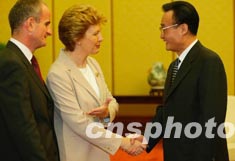 全國(guó)人大常委會(huì)委員長(zhǎng)吳邦國(guó)十日在北京會(huì)見(jiàn)愛(ài)爾蘭總統(tǒng)瑪麗·麥卡利斯。中新社記者:滿會(huì)喬