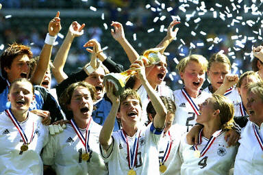 中新網(wǎng)10月13日電 洛杉磯消息:在北京時(shí)間今天凌晨3時(shí)許結(jié)束的第四屆女足世界杯決賽中,德國(guó)隊(duì)與瑞典隊(duì)在90分鐘的比賽中戰(zhàn)成了1-1平。在加時(shí)賽中,德國(guó)隊(duì)?wèi){借著后衛(wèi)金策爾的一粒金球讓瑞典隊(duì)飲恨美利堅(jiān),他們也因此成為該項(xiàng)賽事的新科狀元。德國(guó)隊(duì)頭號(hào)射手普林茨奪取了金靴獎(jiǎng)和金球獎(jiǎng)兩項(xiàng)大獎(jiǎng)。