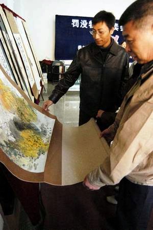 據(jù)遼寧省公物拍賣行有限公司債權(quán)部經(jīng)理董茂貴介紹,此次展出的拍品共有9大類、140余件。在展廳的對(duì)面,墻上懸掛著的16幅名家書畫特別惹眼,其中“瑞氣繞庭”、“成名何須頑石篆,路上行人口是碑”等幾幅字據(jù)說曾是慕綏新比較欣賞的,此時(shí)擺在展室里,卻成了對(duì)貪官絕好的諷刺。里間的櫥柜里擺放著手表、工藝品、書畫、相機(jī)等各種“名牌”貴重物品,很多都是沒有用過的。