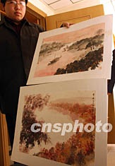 中貿(mào)圣佳國際拍賣公司2003年拍賣會將于十一月一日在北京舉行,傅抱石作品《毛主席詩意山水冊八開》等稀罕珍品成為拍品中一道靚麗風景。該畫作由傅抱石先生在1964、1965年內(nèi)為生前摯友維楨所繪,是作者經(jīng)心閱讀《毛澤東詩詞》后激情創(chuàng)作的八幅佳構(gòu)。圖為工作人員十月中旬展示其中的兩幅《寥廓江天萬里霜》(下)與《芙蓉國里盡朝暉》。中新社記者:武仲林