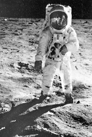1969年7月20日,美國宇航員尼爾·阿姆斯特朗(頭盔中影像)和巴茲·奧爾德林(如圖)乘“阿波羅”11號(hào)飛船首次登上月球。新華社圖
