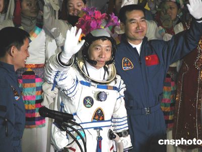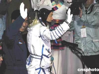 五時(shí)二十八分,循著這有些激動(dòng)的聲音,只見身著乳白色航天服的首飛航天員楊利偉邁著從容而穩(wěn)健的步伐,從問天閣航天員的專用通道,微笑著向大家走來。緊隨他身后的是身著天藍(lán)色訓(xùn)練服的航天員翟志剛和聶海勝。隨著歡快的《迎賓曲》奏起,航天員們被掌聲和鮮花包圍著。