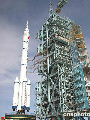 “神舟”五號載人飛船船箭塔組合體順利轉(zhuǎn)運至發(fā)射塔架旁,倚天而立、蓄勢待發(fā)。中新社記者孫自法攝