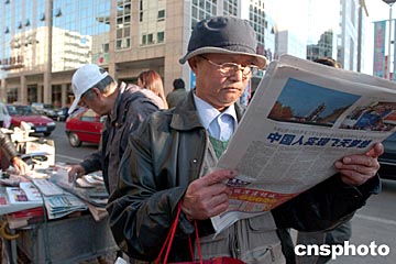 中國第一艘載人飛船“神舟”五號(hào)十五日上午九時(shí)在酒泉衛(wèi)星發(fā)射中心成功發(fā)射升空,北京街頭的市民爭(zhēng)相閱讀有關(guān)報(bào)道。作者:易永明