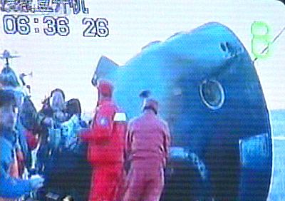 李繼耐宣布:“神舟”五號(hào)載人飛船16日6時(shí)23分在內(nèi)蒙古主著陸場成功著陸,實(shí)際著陸點(diǎn)與理論著陸點(diǎn)相差4.8公里。返回艙完好無損。