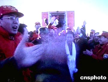 楊利偉十六日清晨走下檢查車,身披蒙古姑娘敬獻(xiàn)的哈達(dá),在眾人的歡呼聲中簇?fù)碇巧巷w向北京的專用直升機(jī)。中新社記者:賈國榮