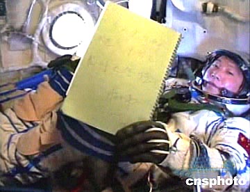 圖:楊利偉在太空中展示航空日記