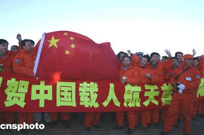 “神舟”五號載人飛船成功著陸,著陸場工作人員展開橫幅慶祝成功。作者:孫陽