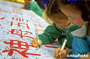十六日,在上海徐家匯公園的“圓飛天夢(mèng),鑄民族魂”——上海市民慶!吧裰邸蔽逄(hào)飛船成功返回活動(dòng)現(xiàn)場(chǎng),幾名上海兒童在慶功條幅上簽名,該簽名長(zhǎng)卷將存列于航天科技館內(nèi),并擬在今后的發(fā)射中帶入太空。作者:劉殊瑾