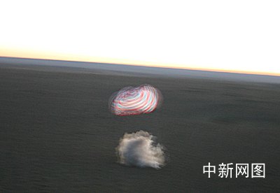 “神舟”五號返回艙反沖火箭點火瞬間。作者:孫陽