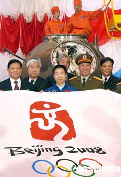 十月十八日,中國(guó)神舟五號(hào)載人飛船回收艙搭載物品開(kāi)艙儀式在中國(guó)航天科技集團(tuán)公司北京空間技術(shù)研制試驗(yàn)中心舉行。中國(guó)首位航天員楊利偉(中)、2008年北京奧運(yùn)會(huì)奧組委主席劉淇(左一)等共同展示太空“乘客”——2008年北京奧運(yùn)會(huì)會(huì)徽旗幟。中新社記者:張煒