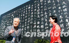 新整修后的王羲之故居矗立一座高大的字碑,被尊稱為天下第一行書的《蘭亭序》篆刻其上,一位參加書圣文化藝術(shù)節(jié)的天津書法愛好者,激動(dòng)地向參觀者訴說自己對(duì)王羲之書法的崇拜。作者:王麗南