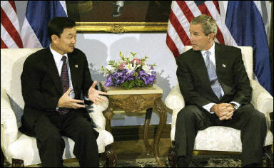報道稱,布什及夫人勞拉于周六晚些時候到達泰國。在嚴密的保安措施之下,布什與泰國總理他信舉行了會晤。據(jù)其隨從透露,布什將授予泰國“美國在北約外主要盟國”地位,并將給泰國提供一系列的援助,以感激泰國兩月前抓獲了“伊斯蘭團”主要領袖漢巴里和其它的反控努力。