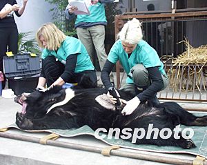 亞洲動(dòng)物基金10月24日在成都中醫(yī)藥大學(xué)召開的“熊膽替代研討會(huì)”上宣稱,該基金正式啟動(dòng)的“拯救黑熊、棄用熊膽”的熊膽替代宣傳教育系列行動(dòng)揭開序幕,以讓更多的亞洲黑熊得到保護(hù)和救助,最終實(shí)現(xiàn)在中國淘汰活熊取膽業(yè)的目標(biāo)。圖為“四川龍橋黑熊救護(hù)中心”的外籍獸醫(yī)為剛從養(yǎng)熊場解救出的亞洲黑熊體檢。作者:魯彥