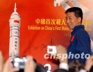 楊利偉表示,來到美麗的香港,一直感受到中華民族大家庭的溫暖,他對能和香港同胞通過展覽一起回顧中國載人航天飛行的光榮歷程感到榮幸。他還被邀請?jiān)谝蝗硕喔叩拇笮驼褂[海報(bào)上簽名。這個(gè)海報(bào)將在本展覽期間向市民展出,然后將為香港科學(xué)館收藏。