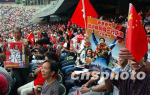 活動(dòng)組織者滿足了人們的這個(gè)愿望。升旗儀式后,楊利偉坐在敞篷車上,繞場一周。人們揮動(dòng)著手中的國旗、區(qū)旗,向他歡呼,向他致敬。